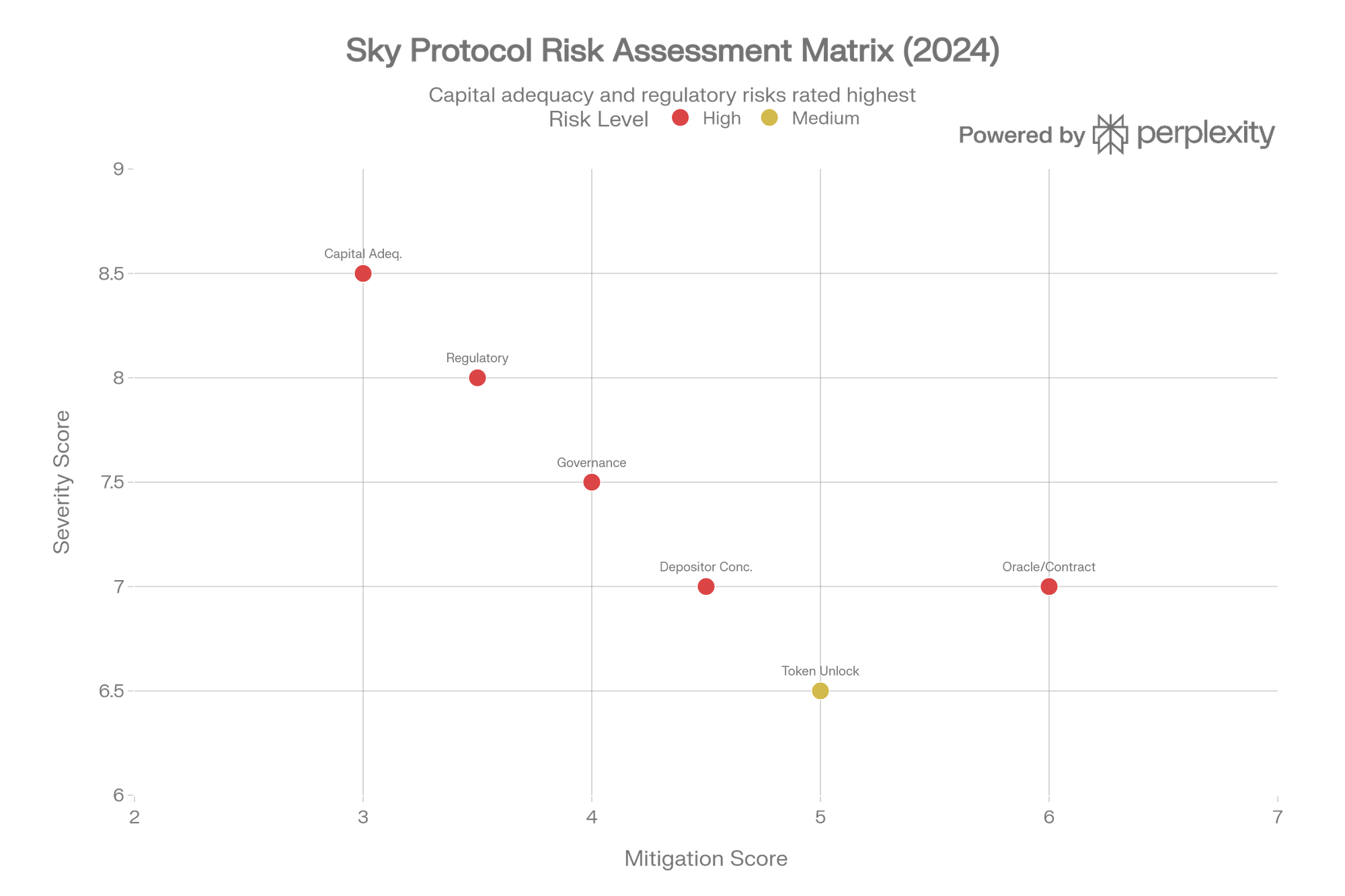 - 资本充足率不足 (8.5/10 风险) — S&P 指出风险调整后资本金仅 0.4%,远低于银行的 8-10% 标准。这意味着在极端市场压力下(如 USDC 再度脱锚),Sky 的缓冲极其薄弱。这是最急迫的结构性风险。[^6]