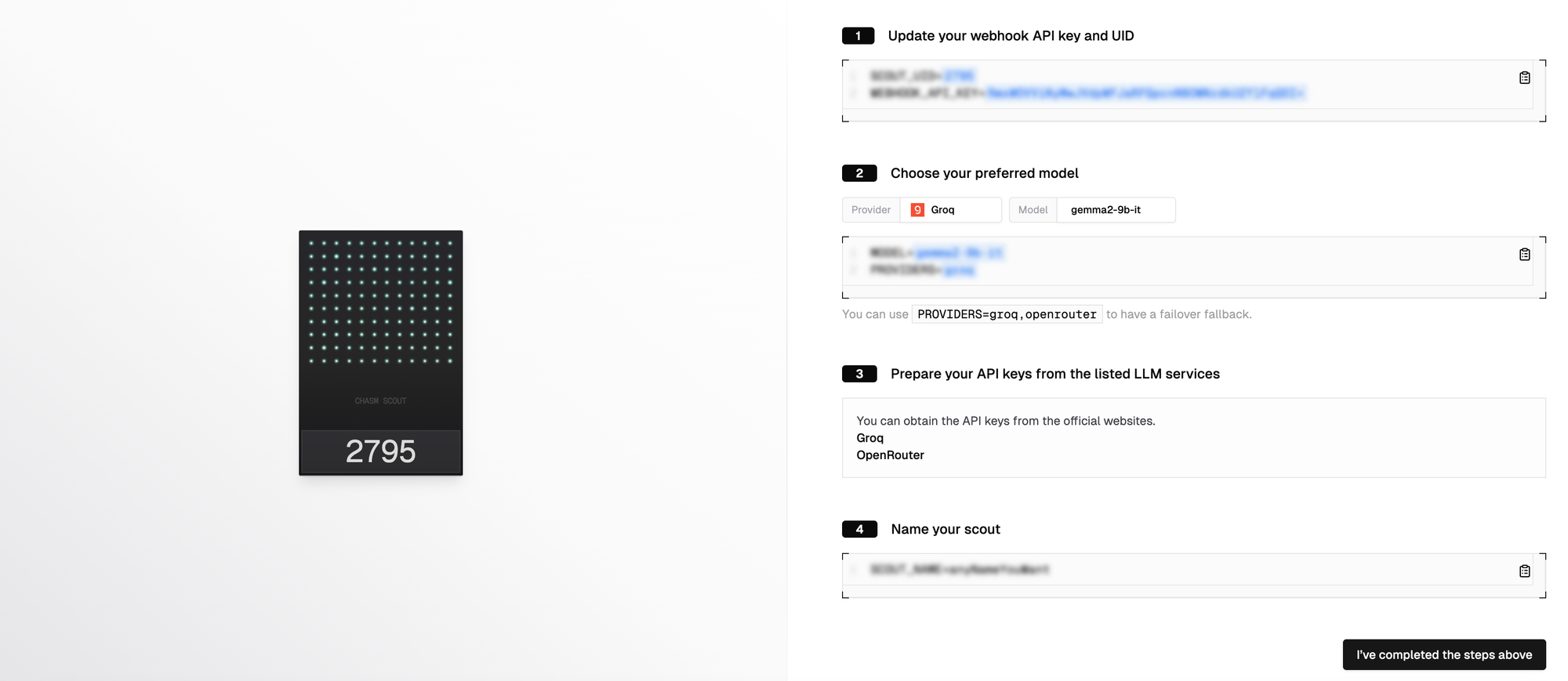 在 https://console.groq.com/keys 注册一个账号并获取到 key 存着后面有用。(如果想要 fallback 的话可以在 https://openrouter.ai/ 注册并拿到对应的 key)。