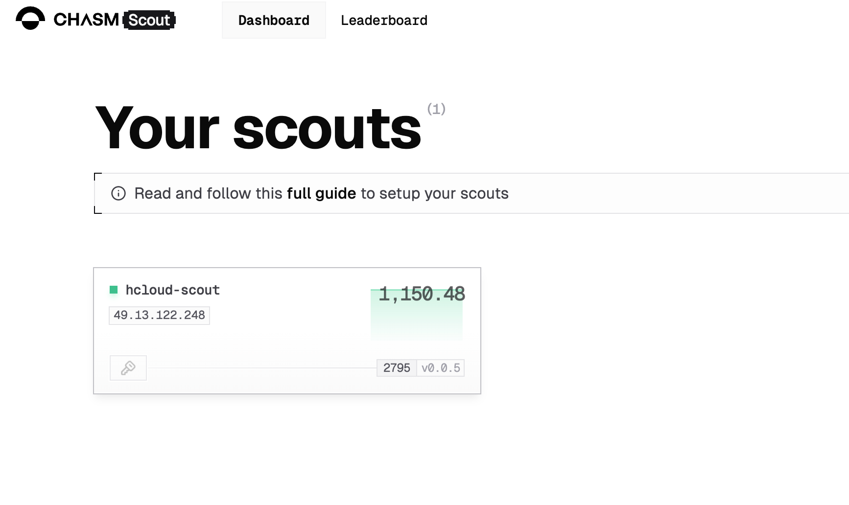 docker run -d --restart=always --env-file ./.env -p 3001:3001 --name scout chasmtech/chasm-scout然后用 docker logs -f scout 查看日志