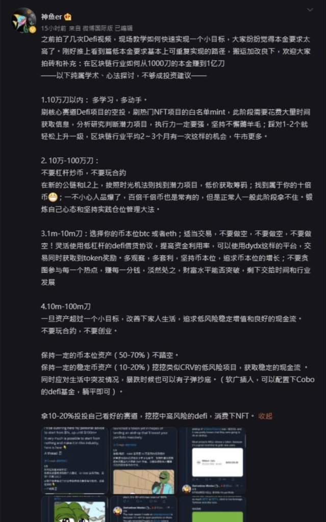 牛市的时候通过一些简单的交互可以博取一些空投的机会,也就是俗称的撸毛了。而神鱼也说过,从 1 万到 10 万,就是通过交互、白名单、各种收集和研究信息,通过薅羊毛的方式来获取收益,考验的只是执行力。因为写的实在是过于中肯和醍醐灌顶,我这边再单独贴一下原文: